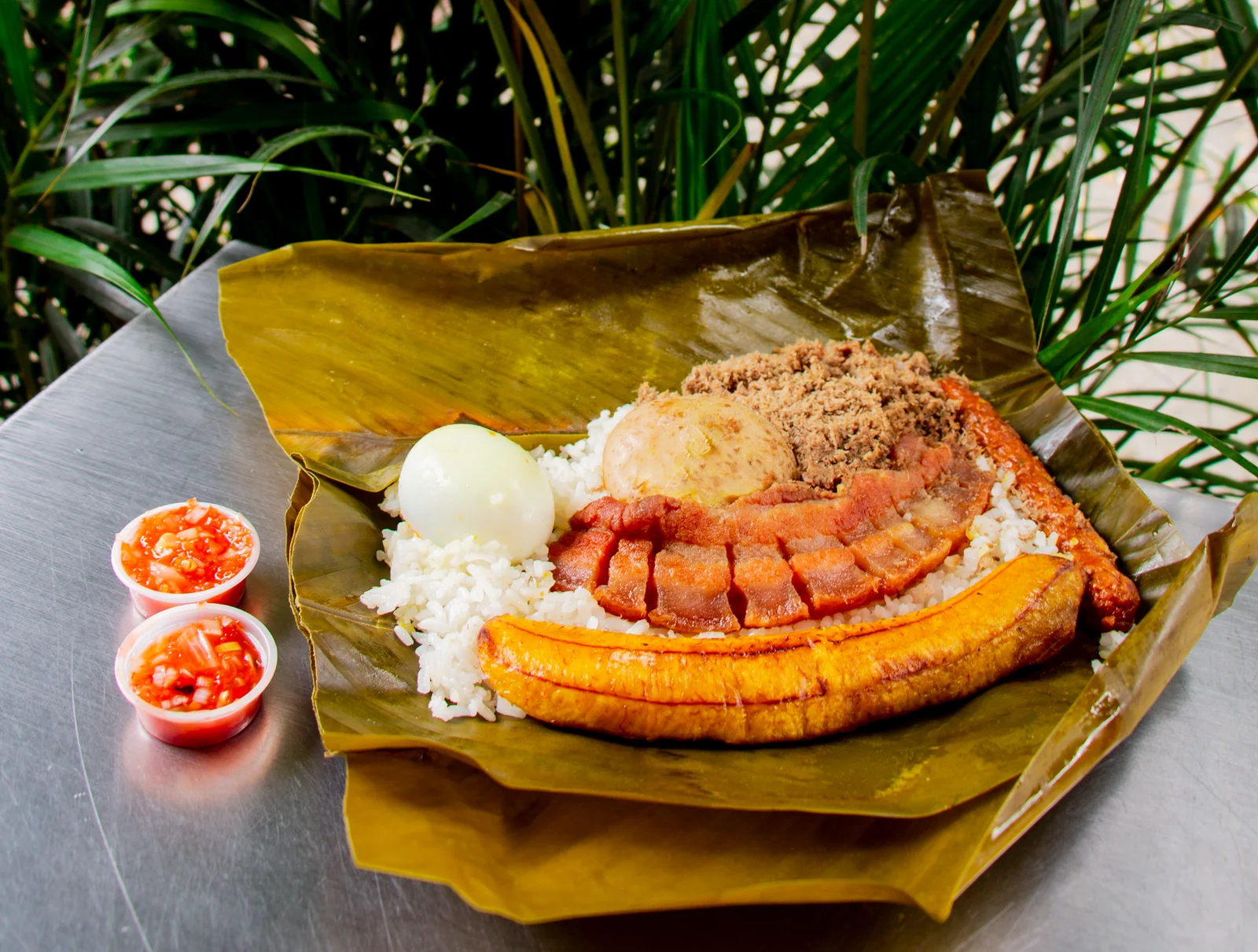 Chicharrón. Costilla de Cerdo. Chorizo Antioqueño. Arroz Asado. Huevo Duro. Arepa Redonda. Plátano Maduro. Yuca Frita. Papa con Hogao.