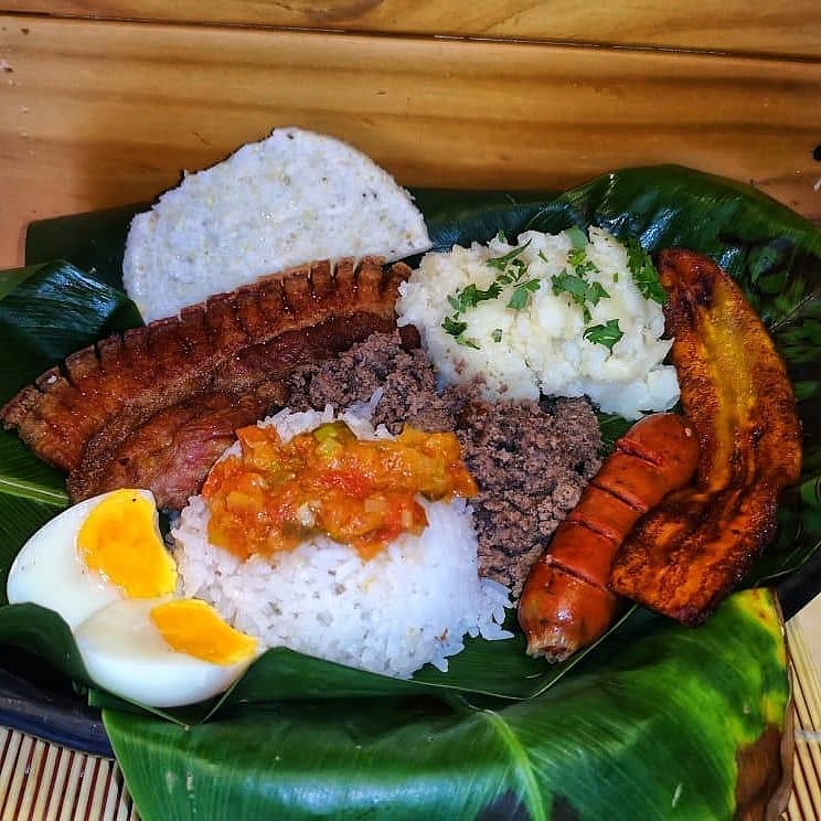 Chicharrón. Costilla de Cerdo. Chorizo Antioqueño. Arroz Asado. Huevo Duro. Arepa Redonda. Plátano Maduro. Yuca Frita. Papa con Hogao.